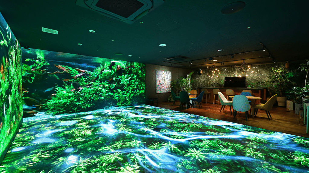 3面LEDパネル/LEDビジョンによりバーチャルな場を設計し、没入型の空間を創出します。「壁」を新たな空間の拡張資産と捉え、バーチャルとリアルをシームレスに結びます。視覚・音響・映像のみならず、来場者の行動に合わせて映像が変化するなど、インタラクションを通じた総合設計も可能です。