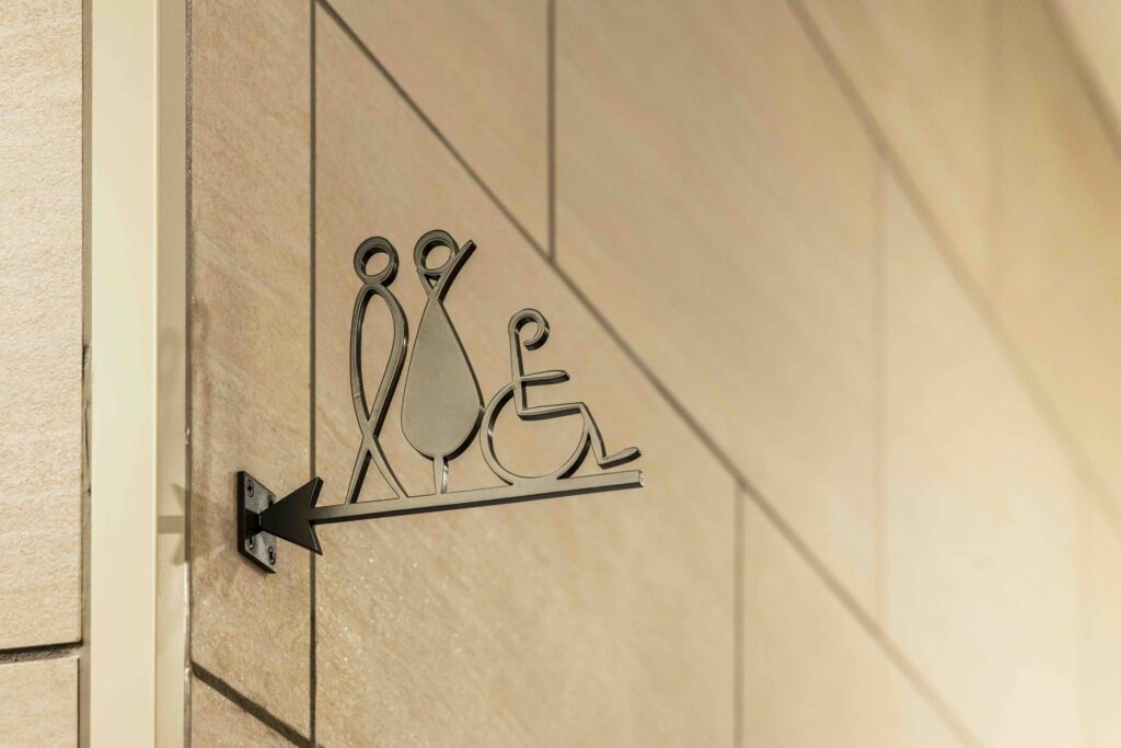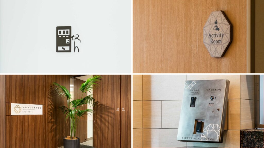 表参道駅徒歩5分の場所に再生された都市の杜の中に佇む、「ツクイ・ののあおやま」シニアレジデンス。ホテルライクな高級感のある内装・インテリアを引き立てるよう、石目をベースとした上質なサインを計画。物件ロゴのダイア柄をモチーフに、住まう方に心地よく寄り添うようなサインデザインとした。