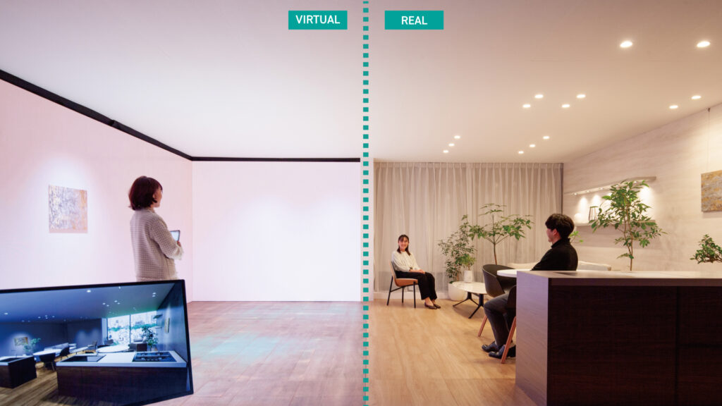 リアルならではの質感を感じながら、シームレスな環境でバーチャルモデルルームを体験可能にすることで、バーチャルの部屋にも臨場感がプラスされ、深い納得感にもつながる効果が期待できる。マージモデルルームの演出手法はモデルルームに限らず、まだ存在しない空間を可視化訴求する演出として非常に有効な手段である。