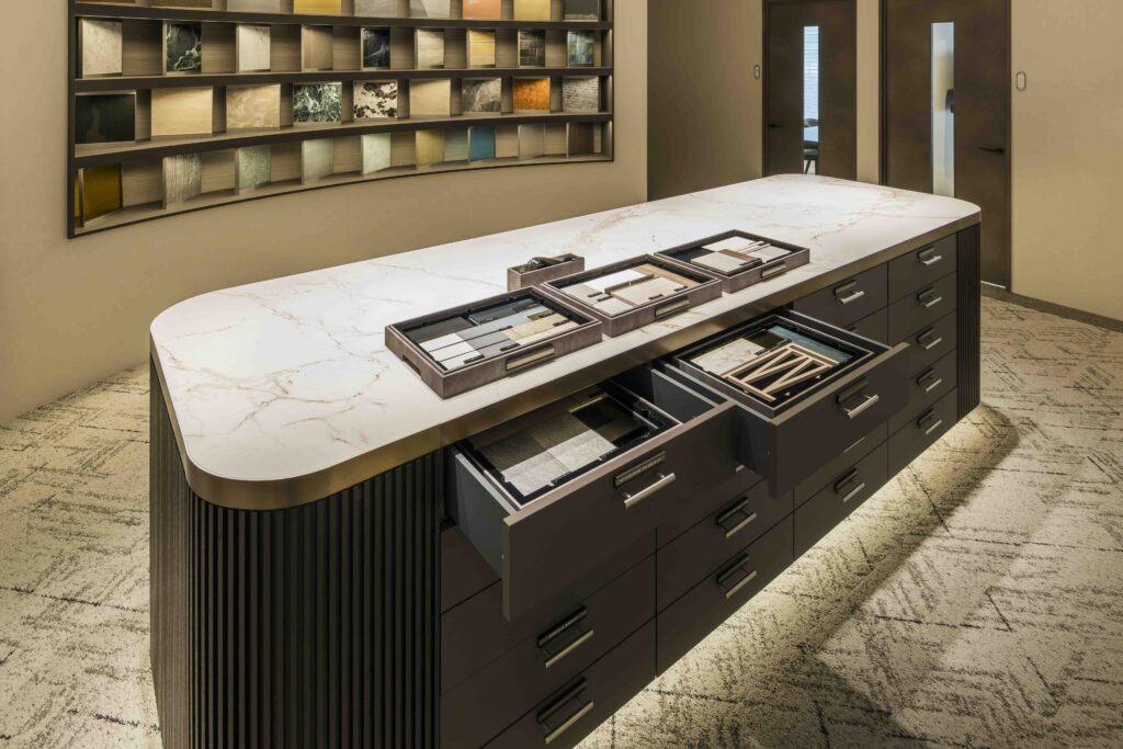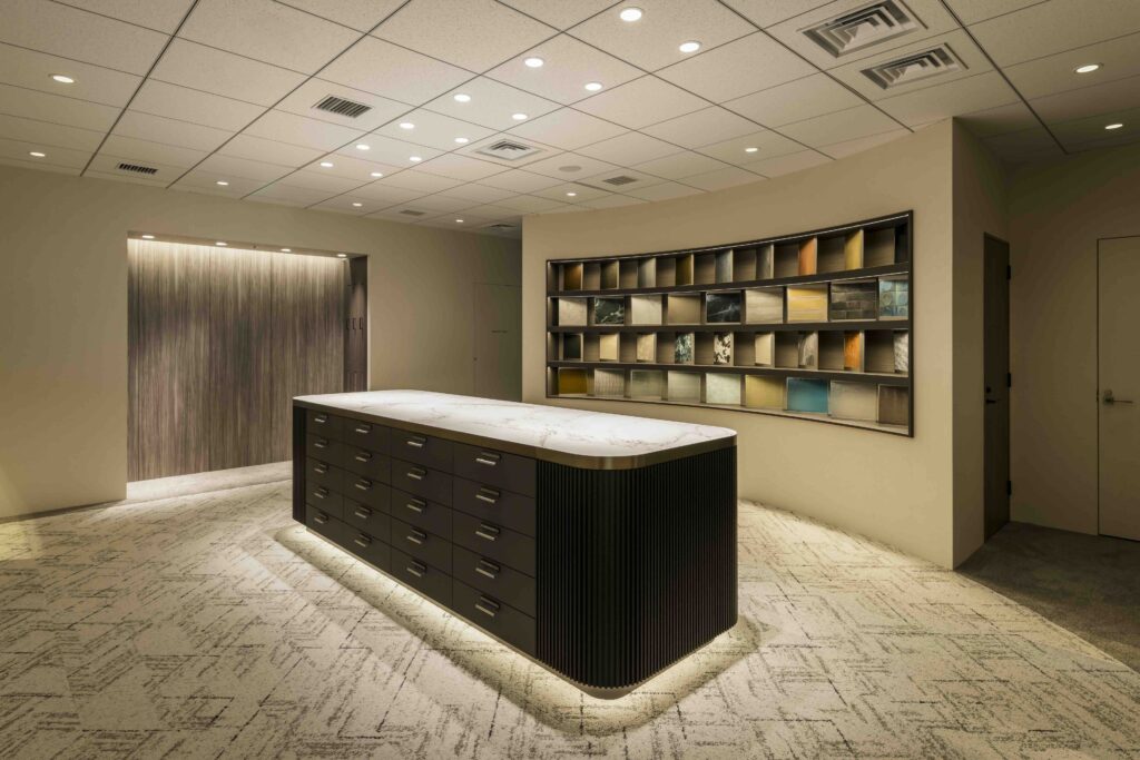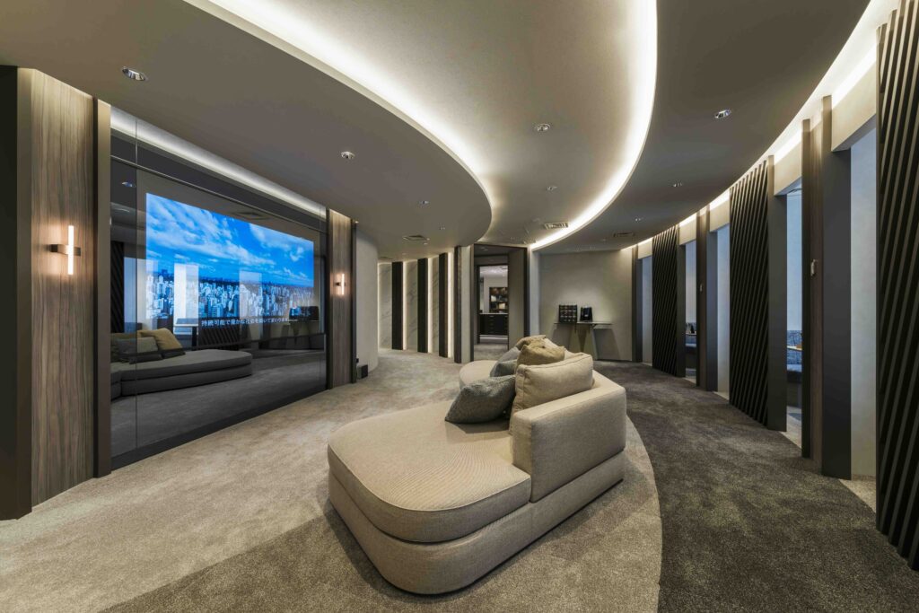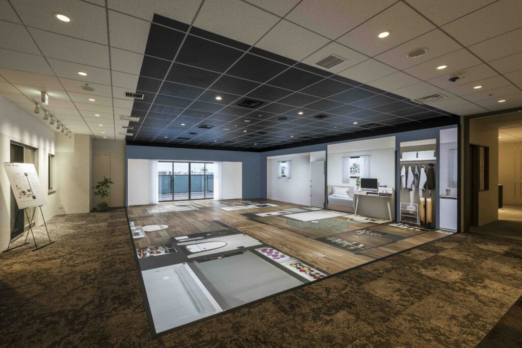 タカラレーベンの常設総合マンションギャラリー。曲面を用いた特徴的なインテリアデザインとした。8m×6mの3面LEDビジョンを用いたプレゼンテーション空間を設え、実物大の間取りや眺望、共用部を迫力ある映像で体験可能。また、タカラレーベンのモノづくりのこだわりを表現したマテリアル展示スペースを設置した。