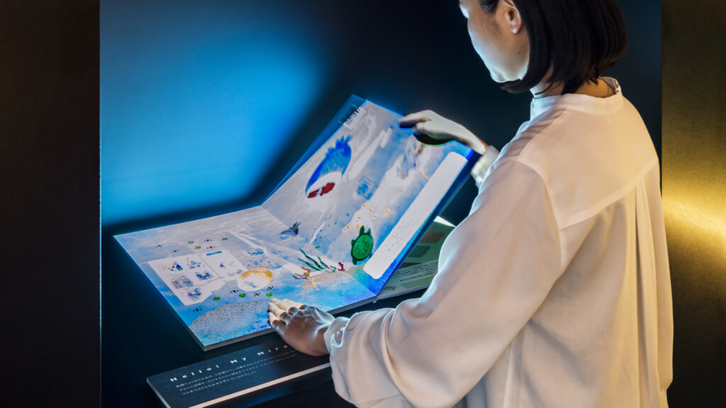 実際の本にプロジェクションした映像を重ねる仕組みで、ページに連動して映像コンテンツが再生され、印字されているものに動きや変化を加えた表現が簡易にできるオリジナルのアプリケーション。ページをめくるというアナログな動きにデジタルな表現を加えることで、リアルな場でこそ体感できるコンテンツとして、新しい情報との出会いや体験をより特別なものにする。