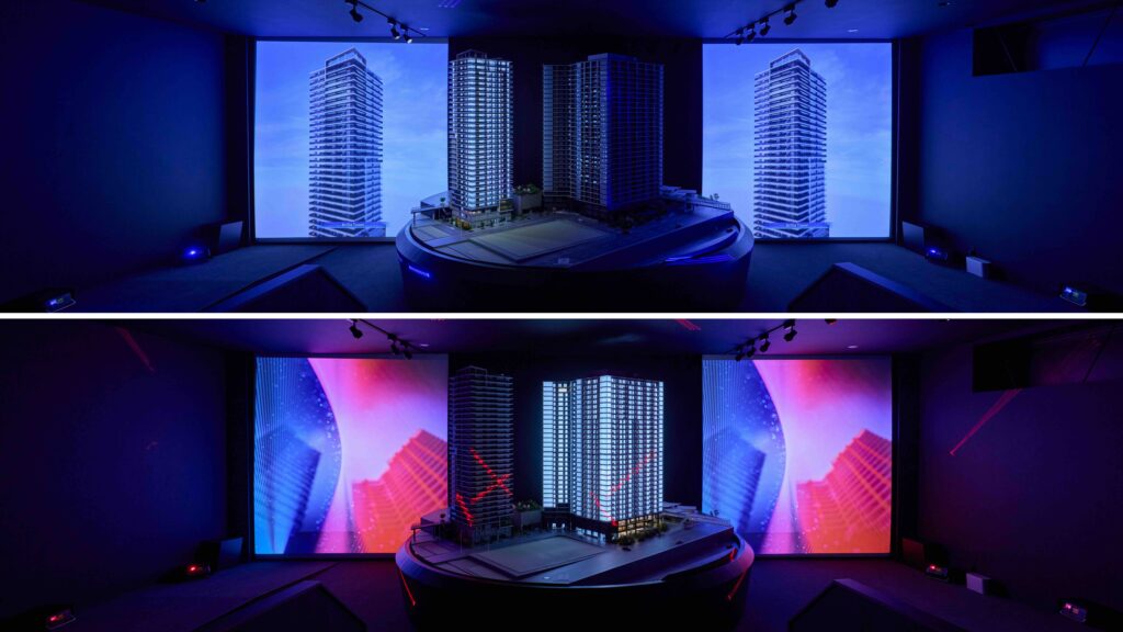 箕面船場の新たなシンボルとして、2つのブランドが並んで建つツインタワーマンションのギャラリー。繊維の街として栄えた街の歴史から、経糸と緯糸の「織り」をイメージした意匠デザインを内外装で表現。模型演出は空間に漂うスモークとレーザーの特殊効果を用いて、鮮烈なインパクトを与えるプレゼンテーションとした。